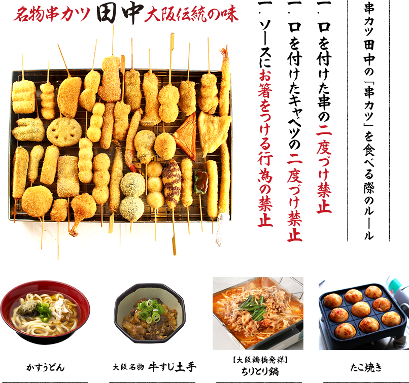 串カツ田中の「串カツ」を食べる際のルール 一. 口を付けた串の二度づけ禁止 一. 口を付けたキャベツの二度づけ禁止 一. ソースにお箸をつける行為の禁止