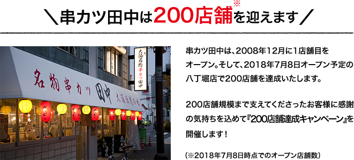 串カツ田中は、2008年12月に1店舗目をオープン。そして、2018年7月8日オープン予定の八丁堀店で200店舗を達成いたします。(※海外店舗を除く)