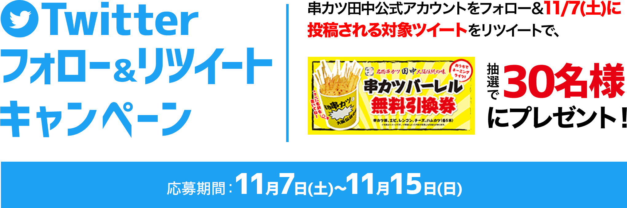●本キャンペーン応募後、当選通知期間が終了する前に、串カツ田中公式Twitterアカウントのフォローを解除された場合は応募対象外となります。