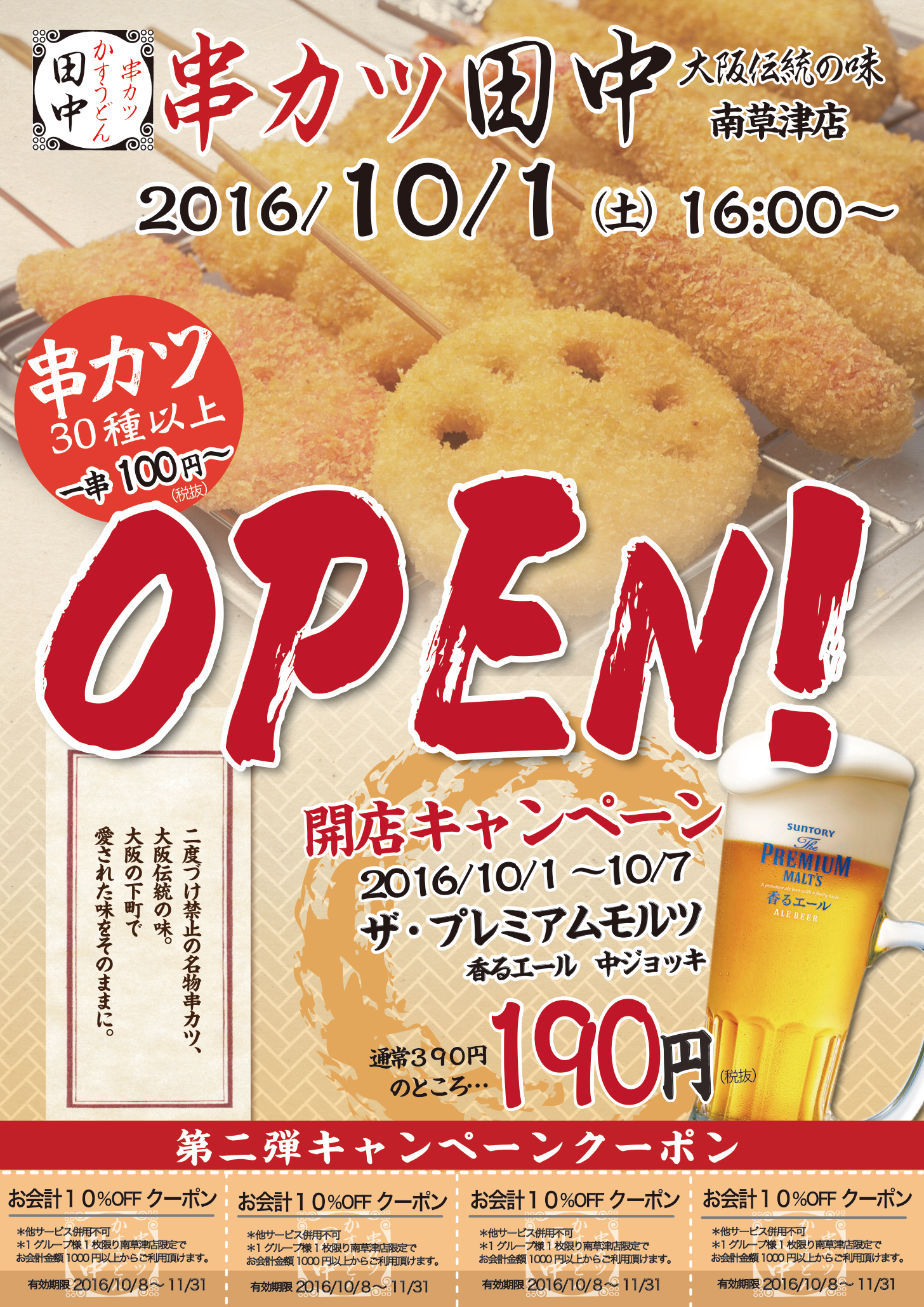 日頃、串カツ田中をご愛顧いただき誠にありがとうございます! 10月1日(土) 串カツ田中 南草津店 串カツ田中 新川崎鹿島田...