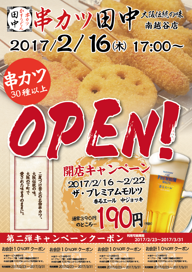 いつも串カツ田中をご愛顧いただき、誠にありがとうございます! 2月16日(木) 串カツ田中 南越谷店 が新規オープンいたします! オ...