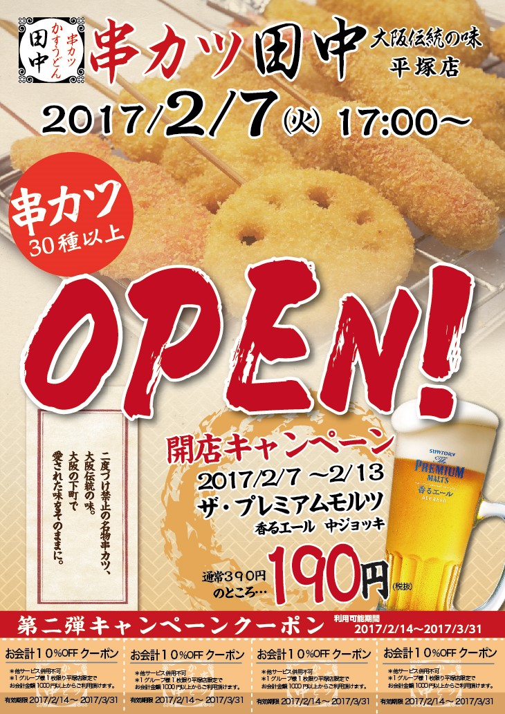 いつも串カツ田中をご愛顧いただき、誠にありがとうございます! 2月7日(火) 串カツ田中 平塚店 が新規OPENいたします! オープ...