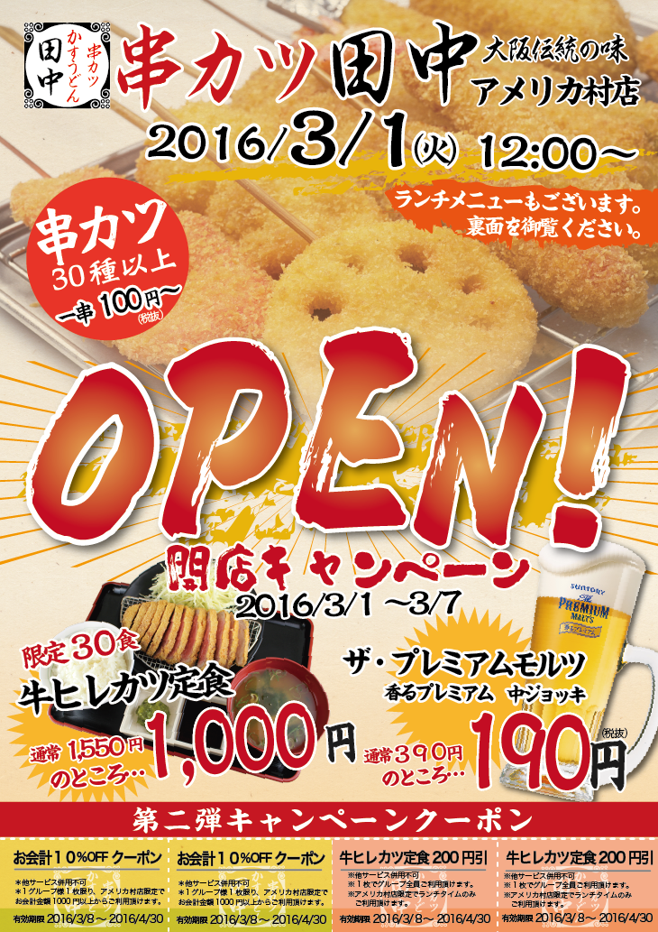 日頃、串カツ田中をご愛顧いただきまして誠に有難うございます! 3月1日(火) 串カツ田中アメリカ村店が新規OPEN致します!! ■ランチ営...