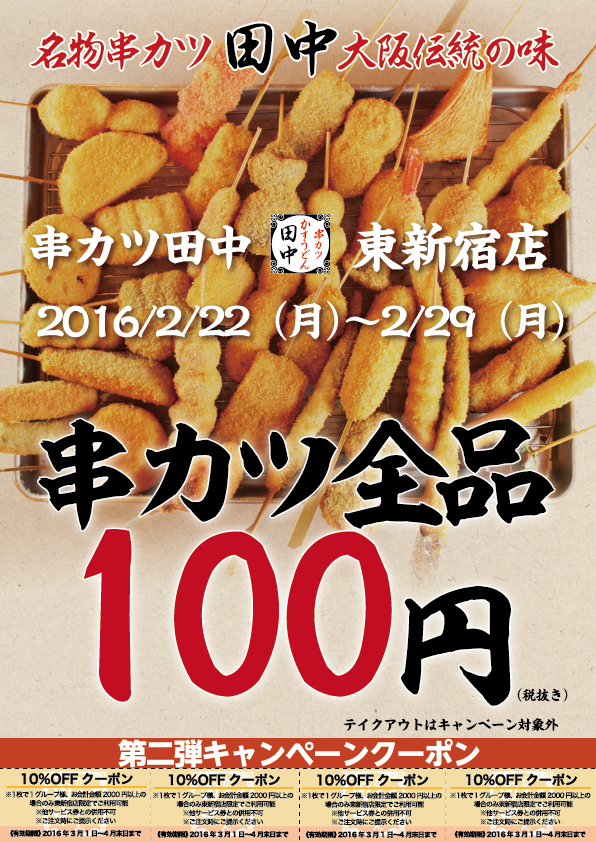 日頃、串カツ田中東新宿店をご愛顧いただきまして誠に有難うございます! 地域の皆様への感謝の気持ちを込めまして、 東新宿店限定でキャン...