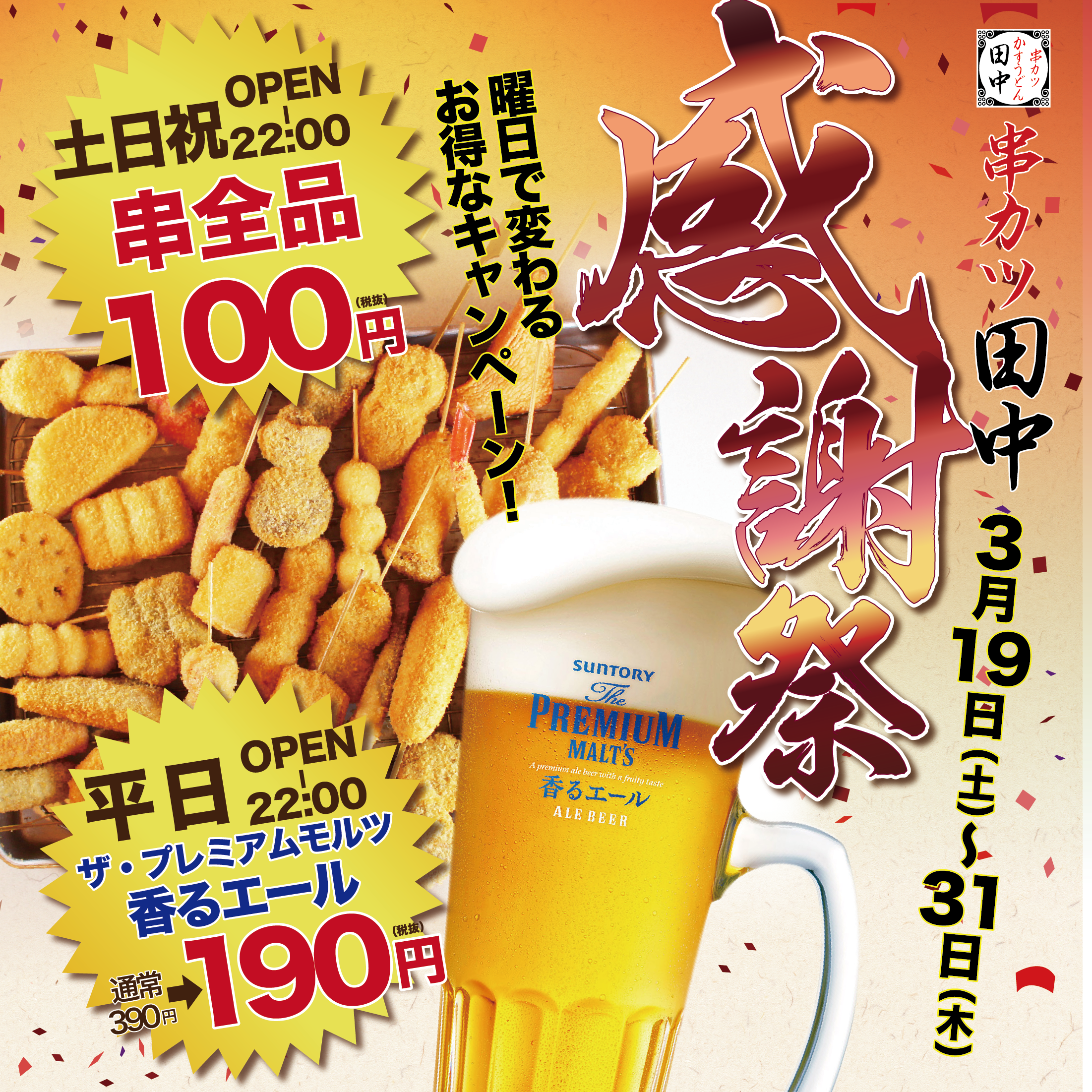 日頃、串カツ田中をご愛顧頂きまして誠にありがとうございます! 地域の皆様への感謝の気持ちを込めまして、 13店舗限定で『感謝祭』を開催...