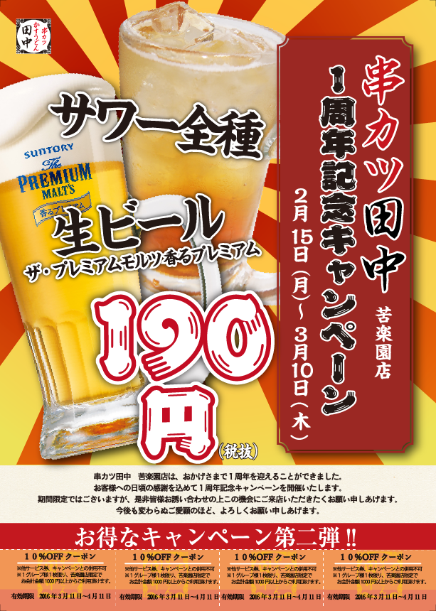 日頃、串カツ田中苦楽園店をご愛顧いただきまして、誠に有難うございます。 地域の皆様に支えられ、苦楽園店は1周年を迎えることができまし...