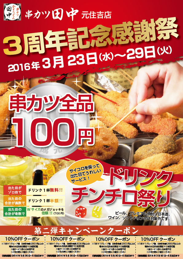 日頃、串カツ田中元住吉店をご愛顧頂きまして誠に有難うございます! 地域の皆様に支えられ、 元住吉店は3周年を迎えることができました!...