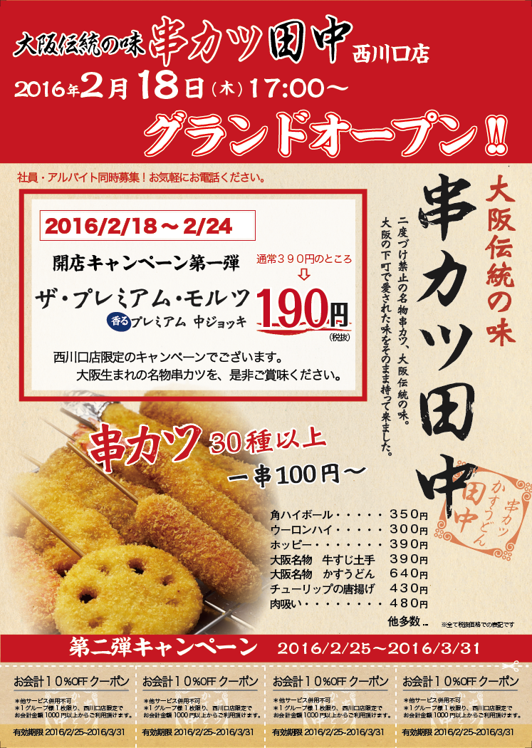 2月18日(木) 串カツ田中西川口店が新規オープン致します! 西川口店限定オープンキャンペーンとしまして 2月18日~24日の間、 ザ・プレミ...