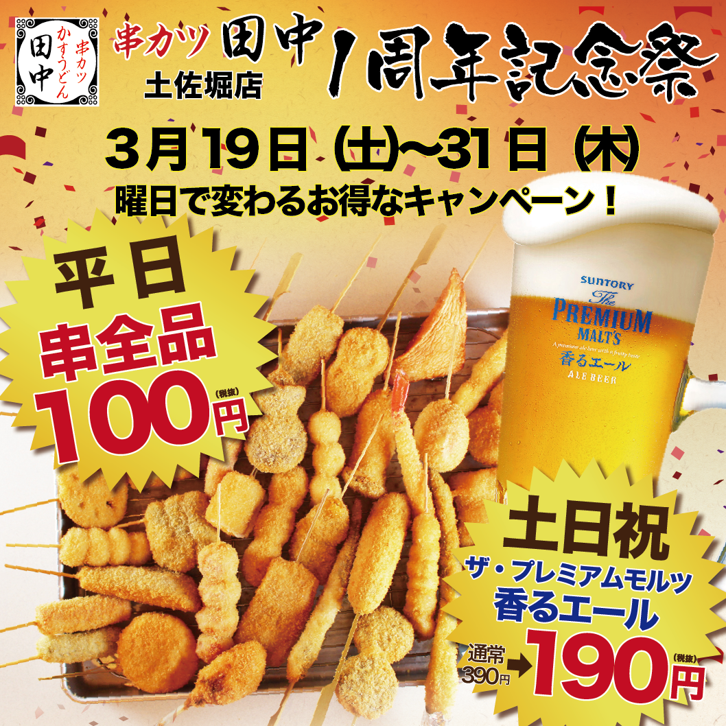 日頃、串カツ田中土佐堀店をご愛顧頂きまして誠にありがとうございます! 地域の皆様に支えられ、土佐堀店は1周年を迎えることができました...