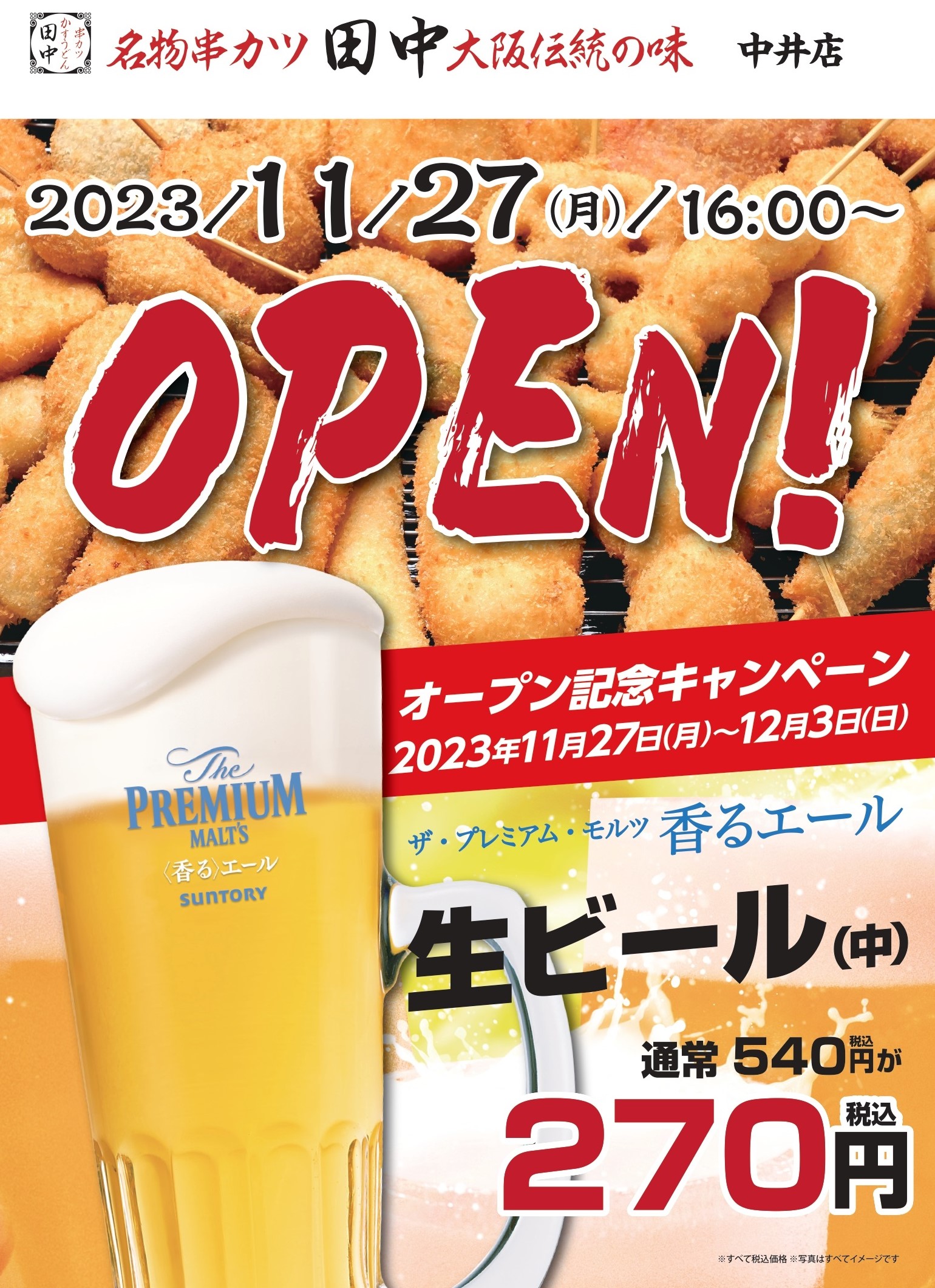串カツ田中 中井店が 2023年11月27(月) 16:00~ オープンいたします! オープンを記念し、中井店では 以下のキャンペーンを開催いたします...