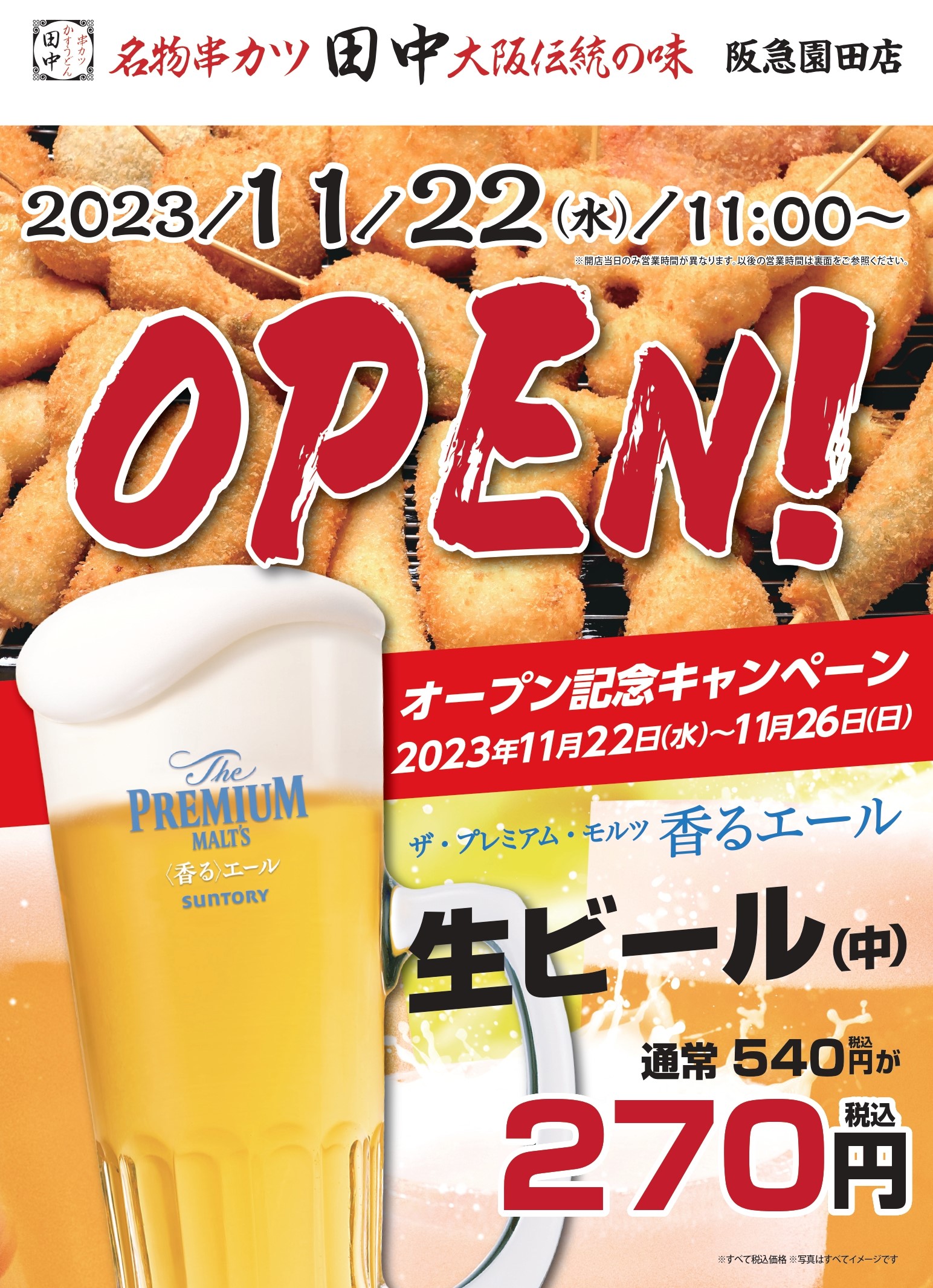 串カツ田中 五反田駅前店が 2023年11月7(火) 16:00~ オープンいたします! オープンを記念し、五反田駅前店では 以下のキャンペーンを開...