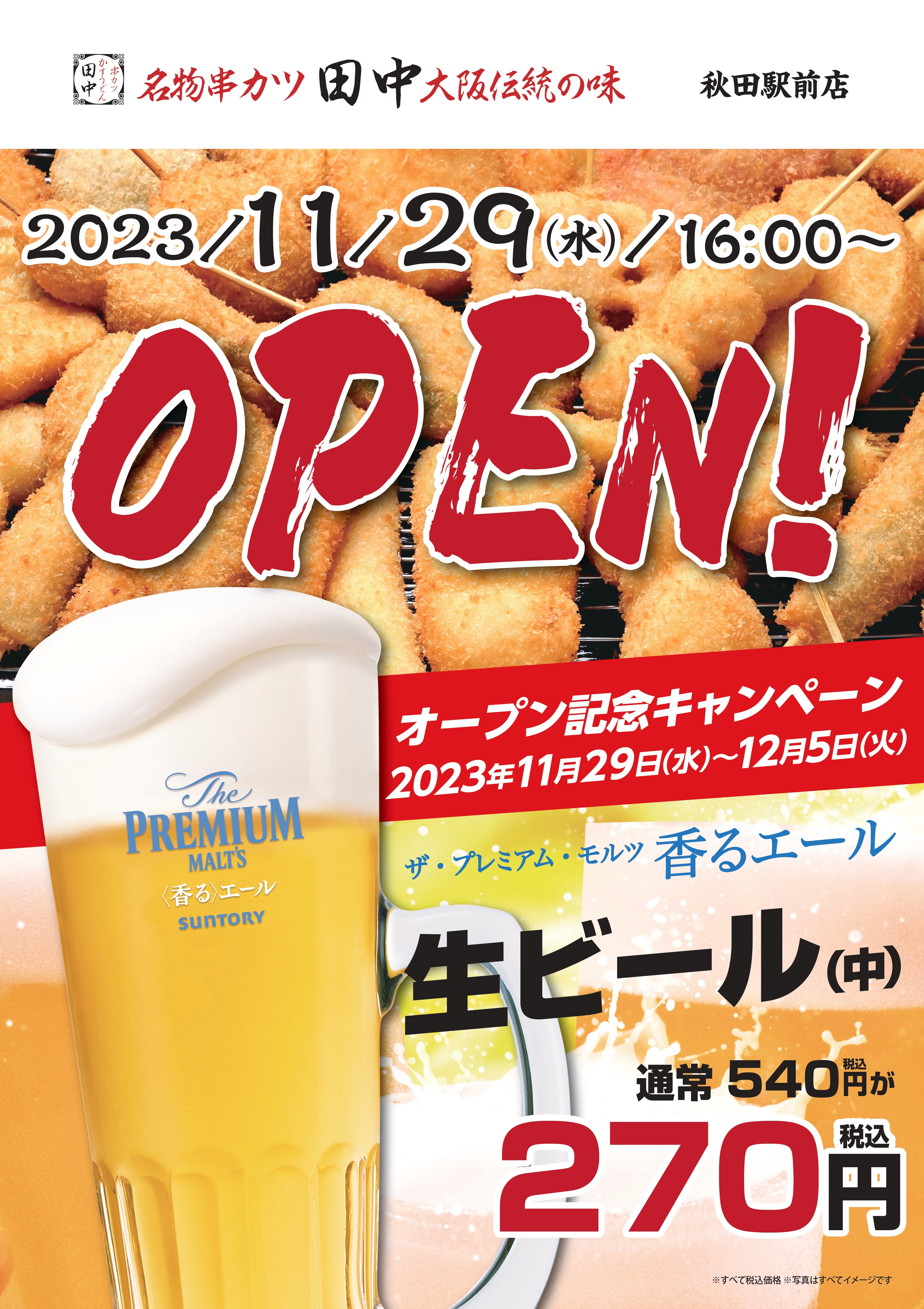 串カツ田中 秋田駅前店が 2023年11月29(水) 16:00~ オープンいたします! オープンを記念し、秋田駅前店では 以下のキャンペーンを開催い...