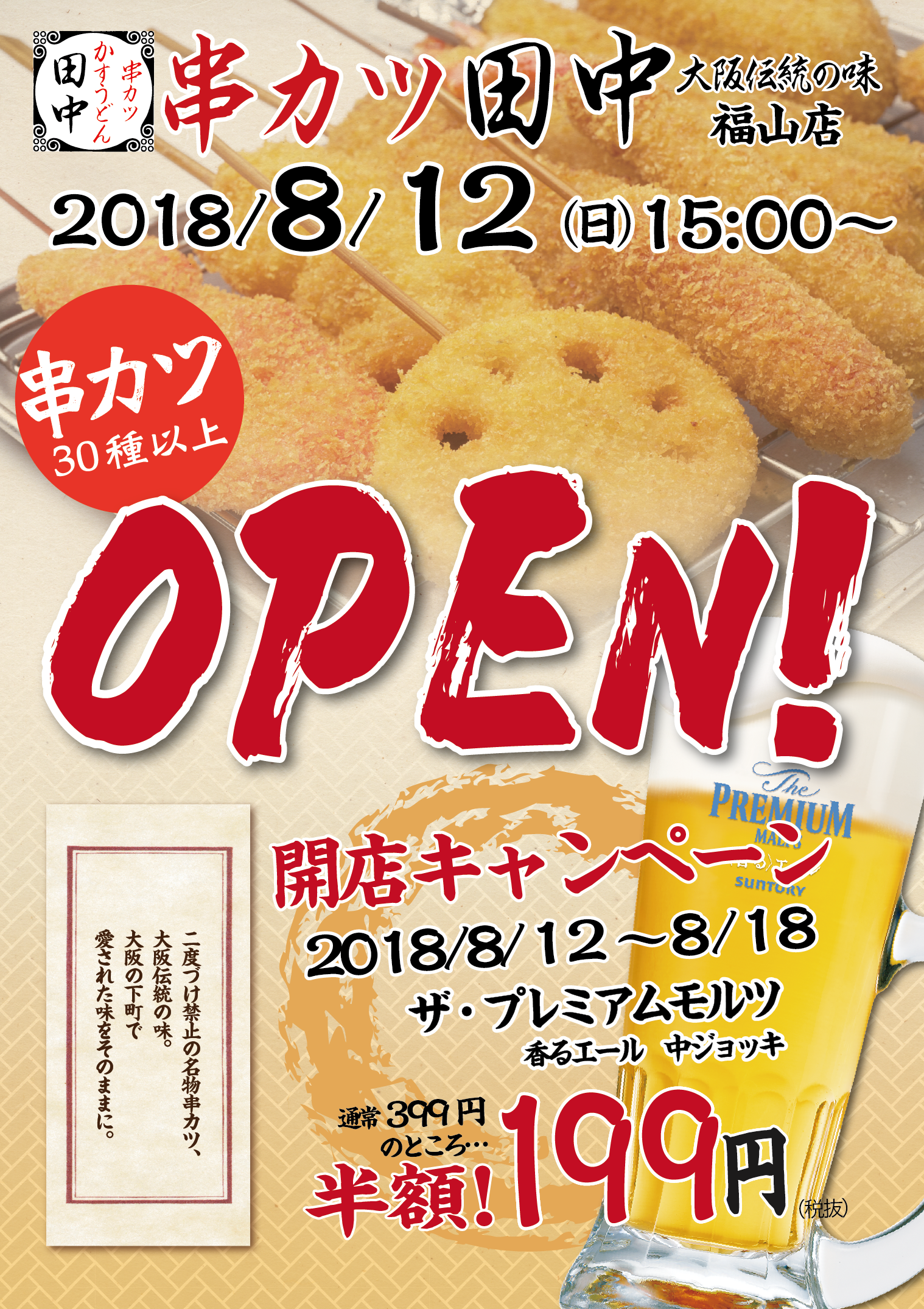 いつも串カツ田中をご愛顧いただき、誠にありがとうございます! 8月12日(日)15:00~ 串カツ田中 福山店 が新規オープンいたします! ...
