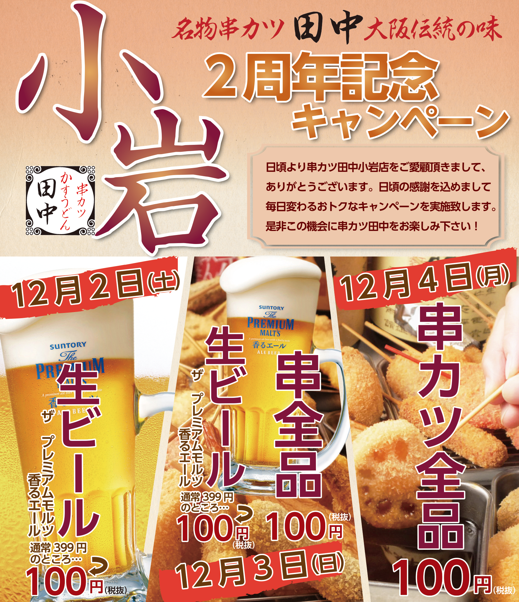 いつも串カツ田中小岩店をご愛顧いただき、誠にありがとうございます! 地域の皆さまに支えられ 小岩店は2周年を迎えることができました! ...