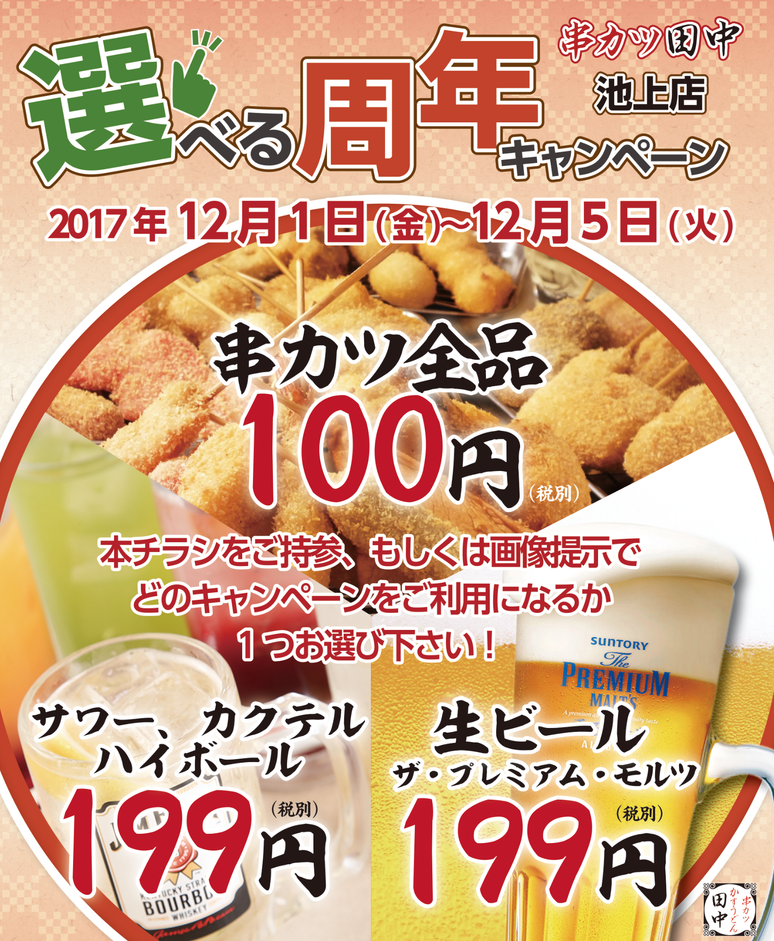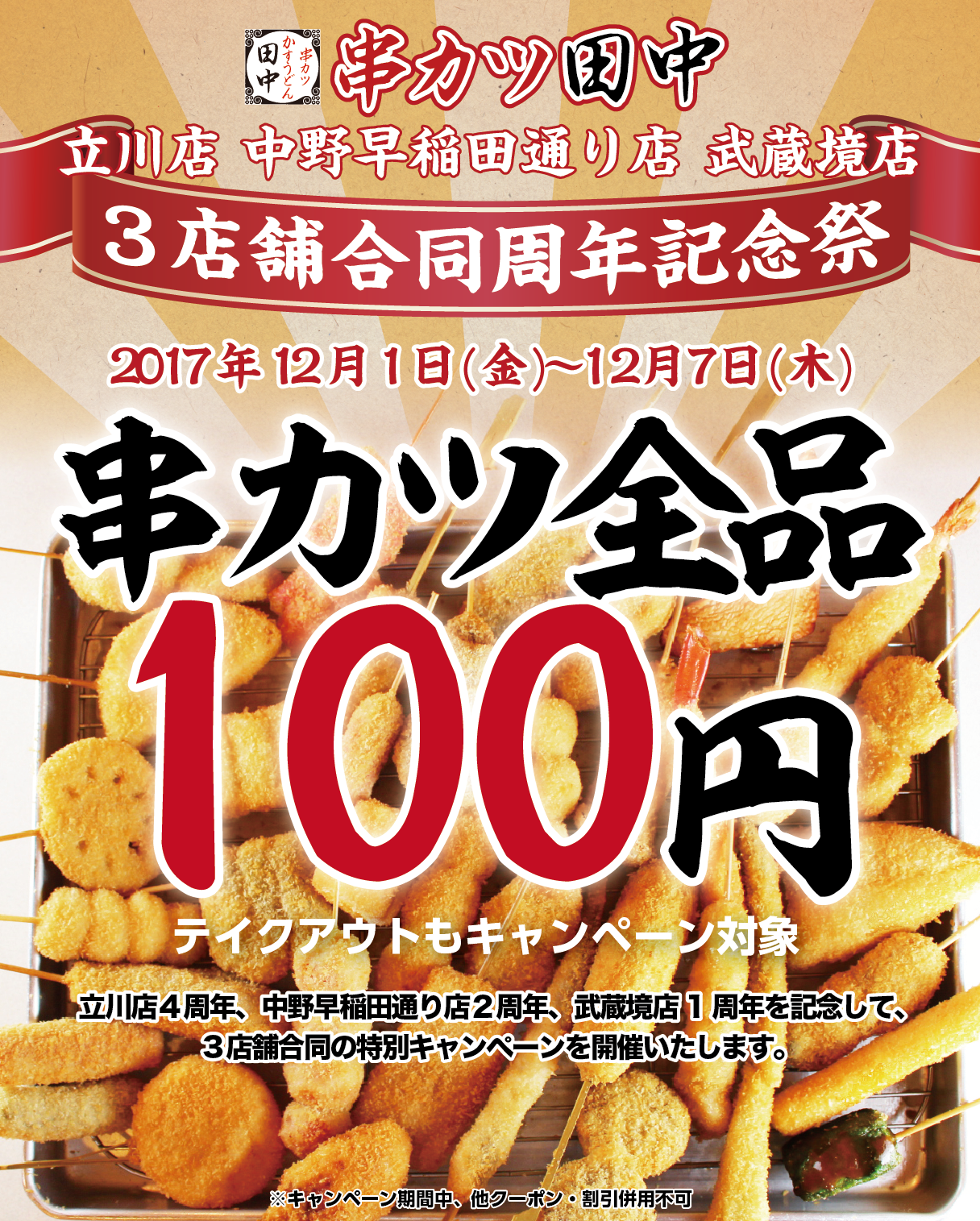 いつも串カツ田中をご愛顧いただき、誠にありがとうございます! 地域の皆さまに支えられ *立川店 4周年 *中野早稲田通り店 2周年 *武蔵...