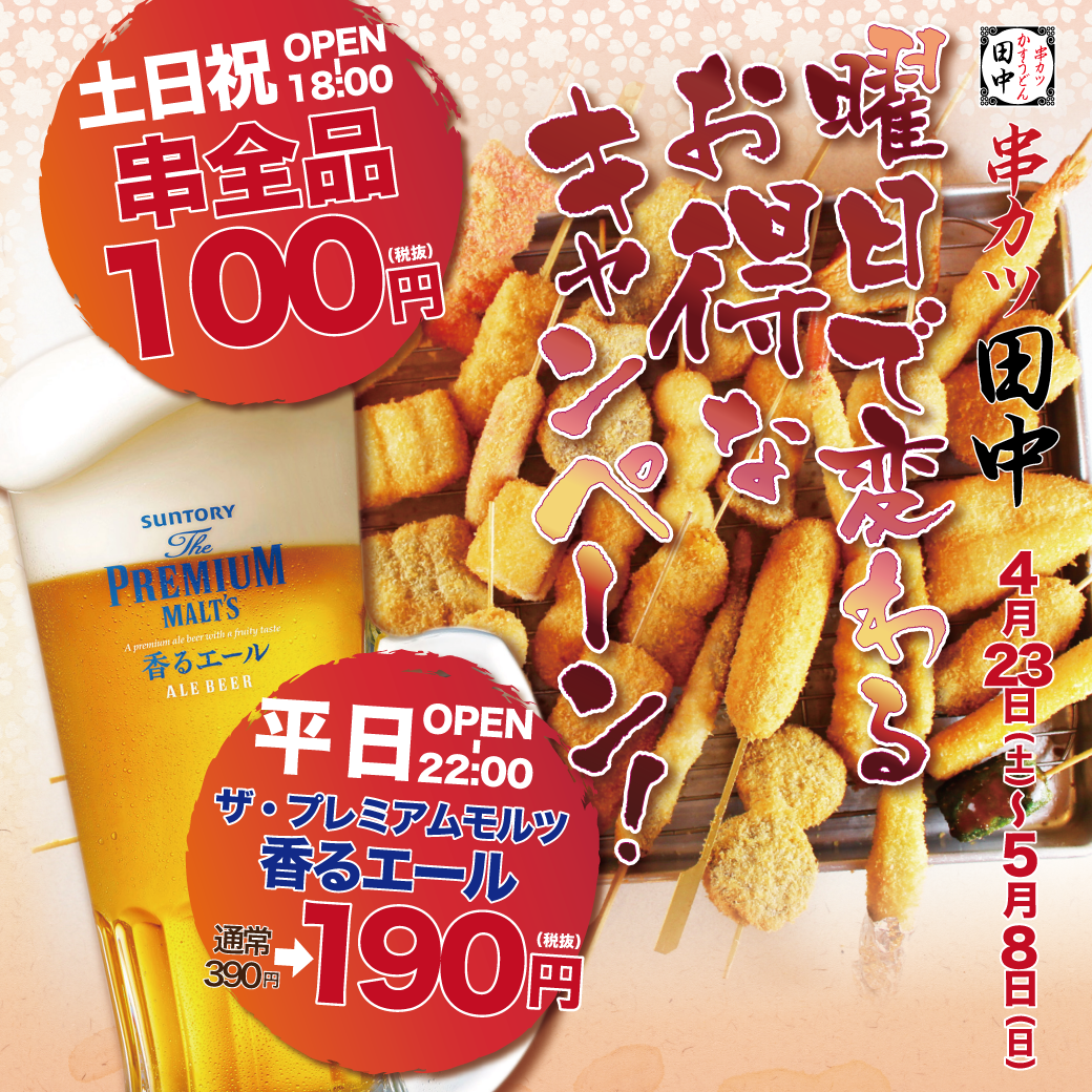 日頃、串カツ田中をご愛顧頂きまして誠に有難うございます! 4月23日~5月8日のあいだ ≪平日OPEN~22時≫ ザ・プレミアムモルツ香るエー...