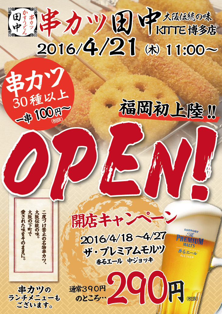 日頃、串カツ田中をご愛顧頂きまして誠に有難うございます! 4月21日(木) ■KITTE博多店 ■相模大野店 2店舗同日OPENいたします! 両店舗...