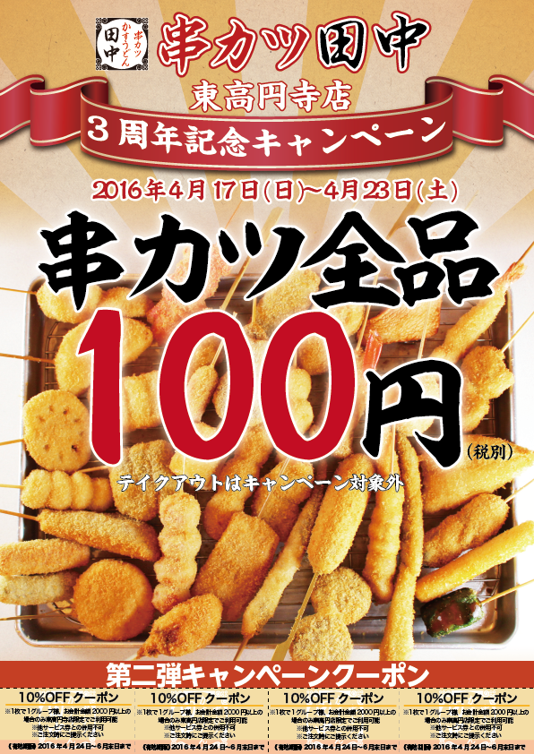 日頃、串カツ田中東高円寺店をご愛顧頂きまして誠にありがとうございます! 地域の皆様に支えられ、 東高円寺店は3周年を迎えることができ...
