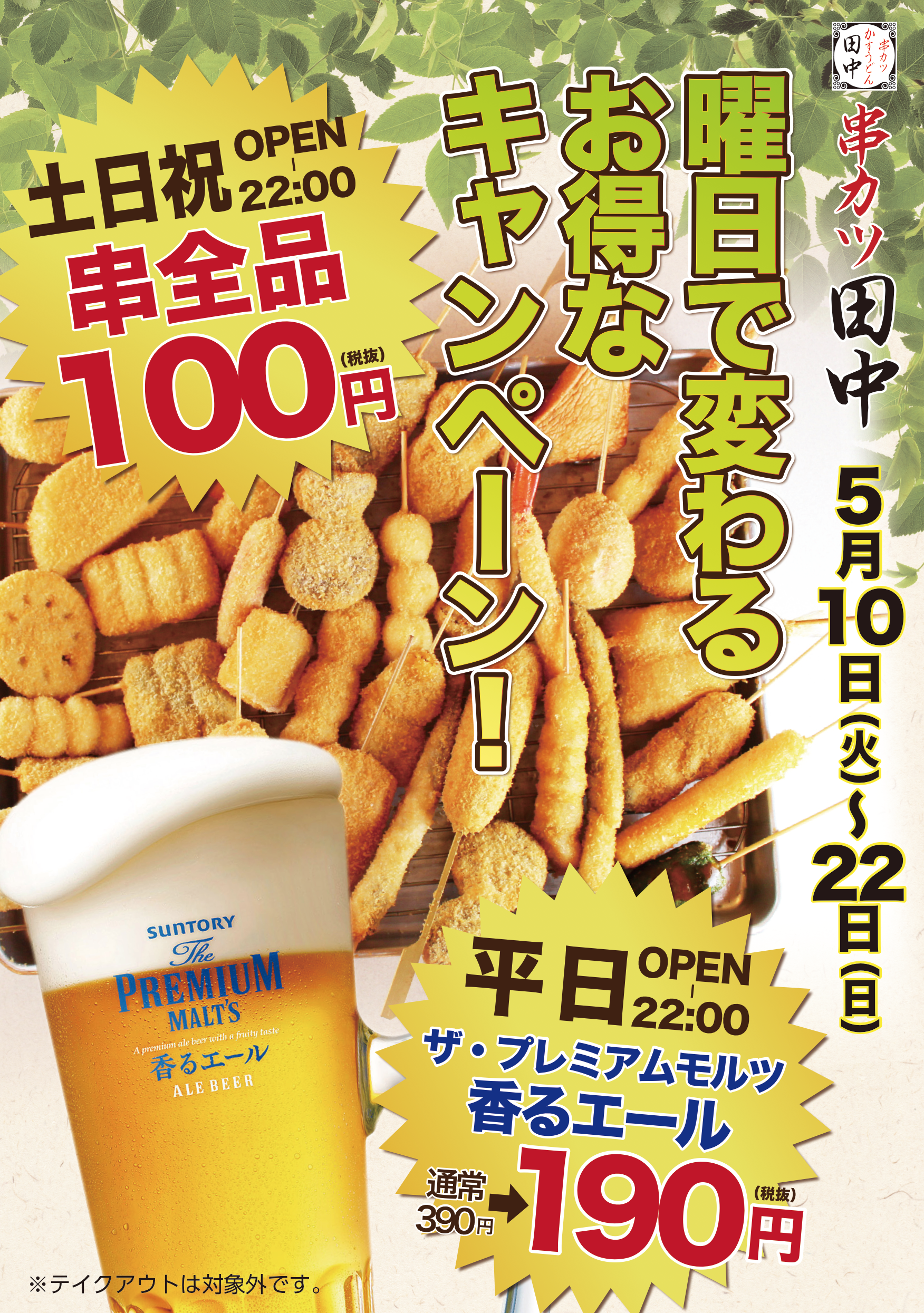 日頃、串カツ田中をご愛顧頂きまして誠に有難うございます! 5月10日~22日のあいだ、 『曜日で変わるお得なキャンペーン』を開催い...
