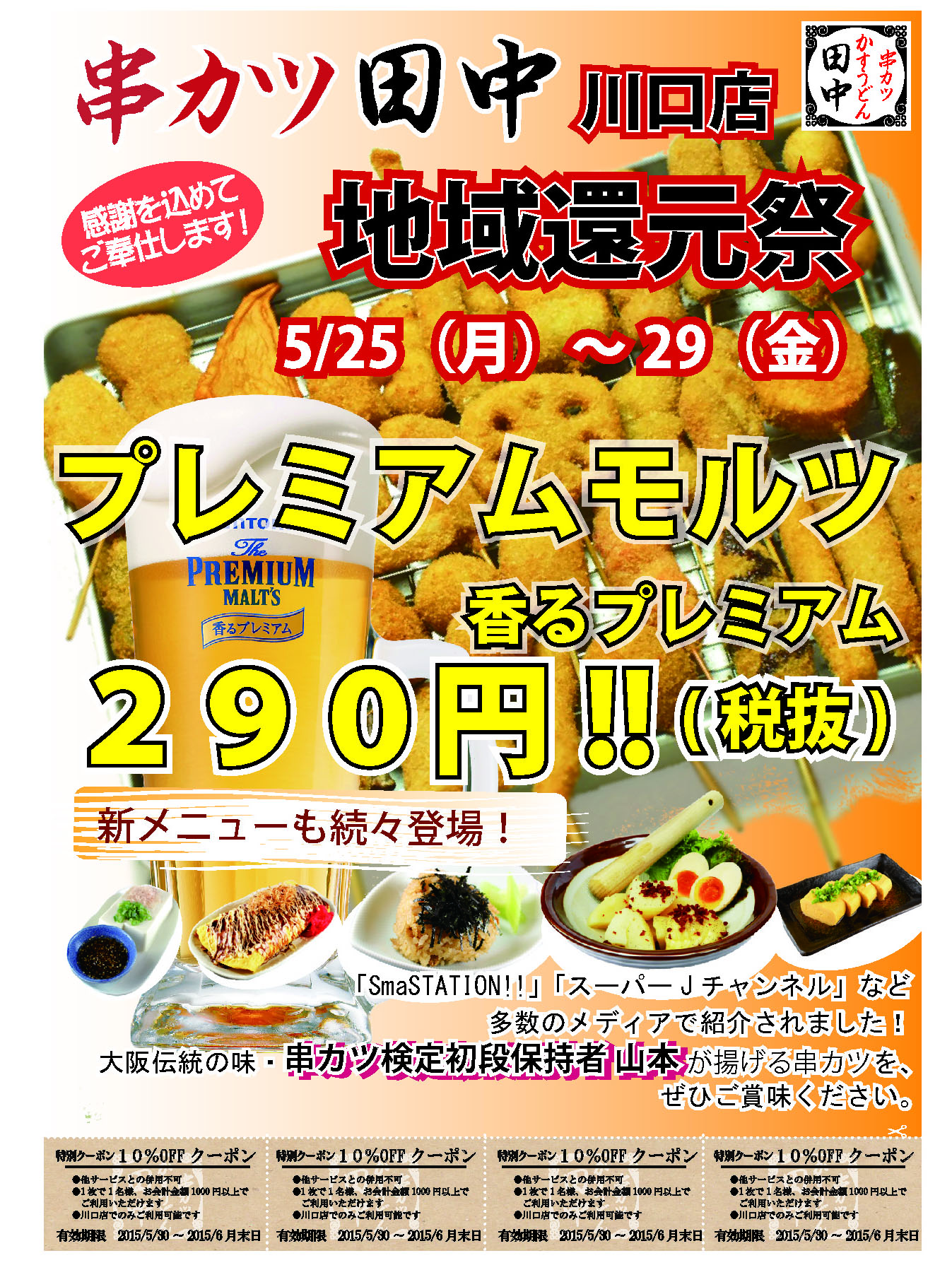 4月13日、串カツ田中泉北店がオープンします! 13日~19日まではオープンキャンペーンとしてビールが190円です! 下のチラシを印刷すれば第...