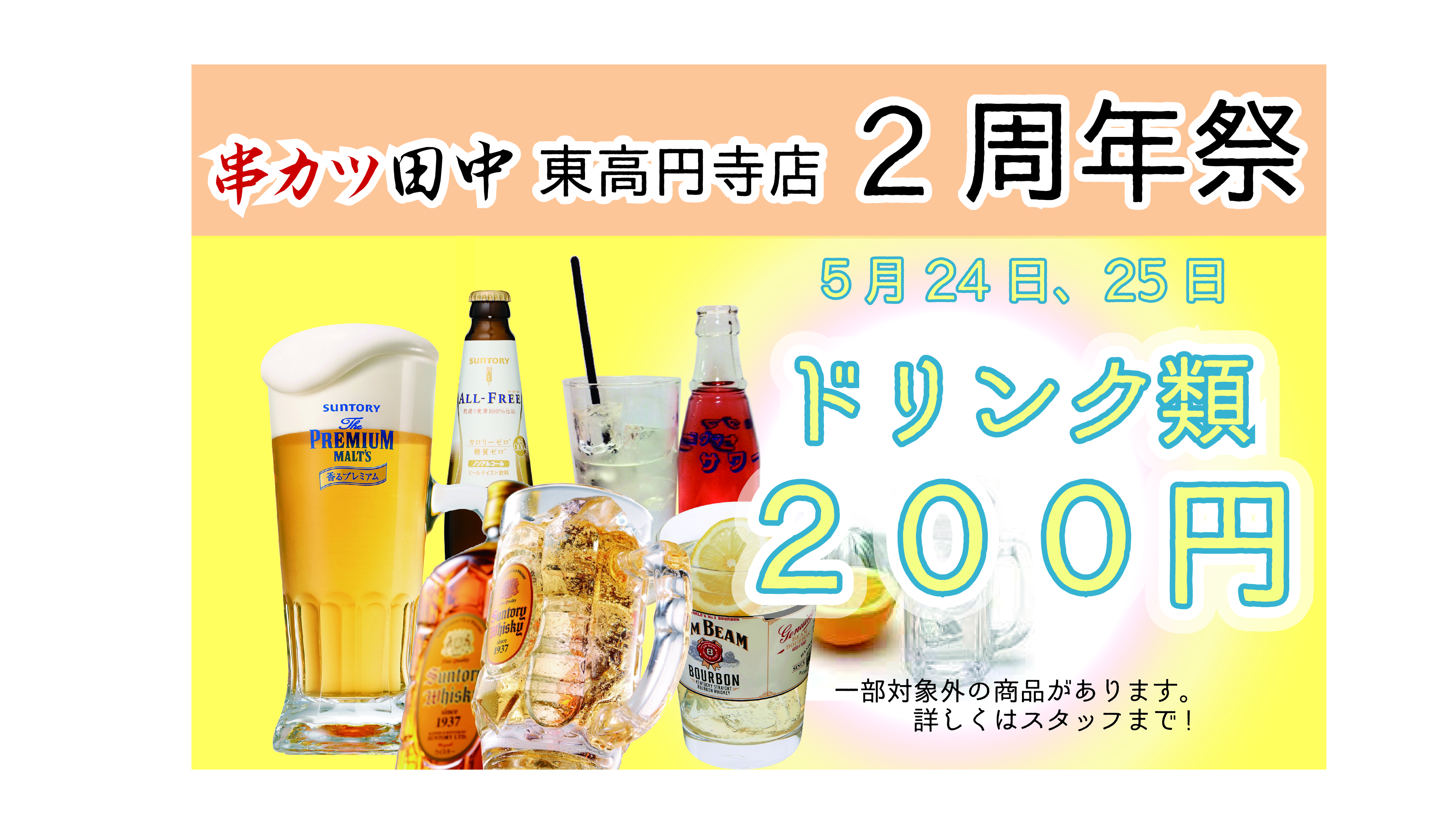 日頃、串カツ田中をご利用頂きありがとうございます。 皆様にご愛顧頂き、東高円寺店は2周年を迎えることが出来ました。 今回皆様への感謝...