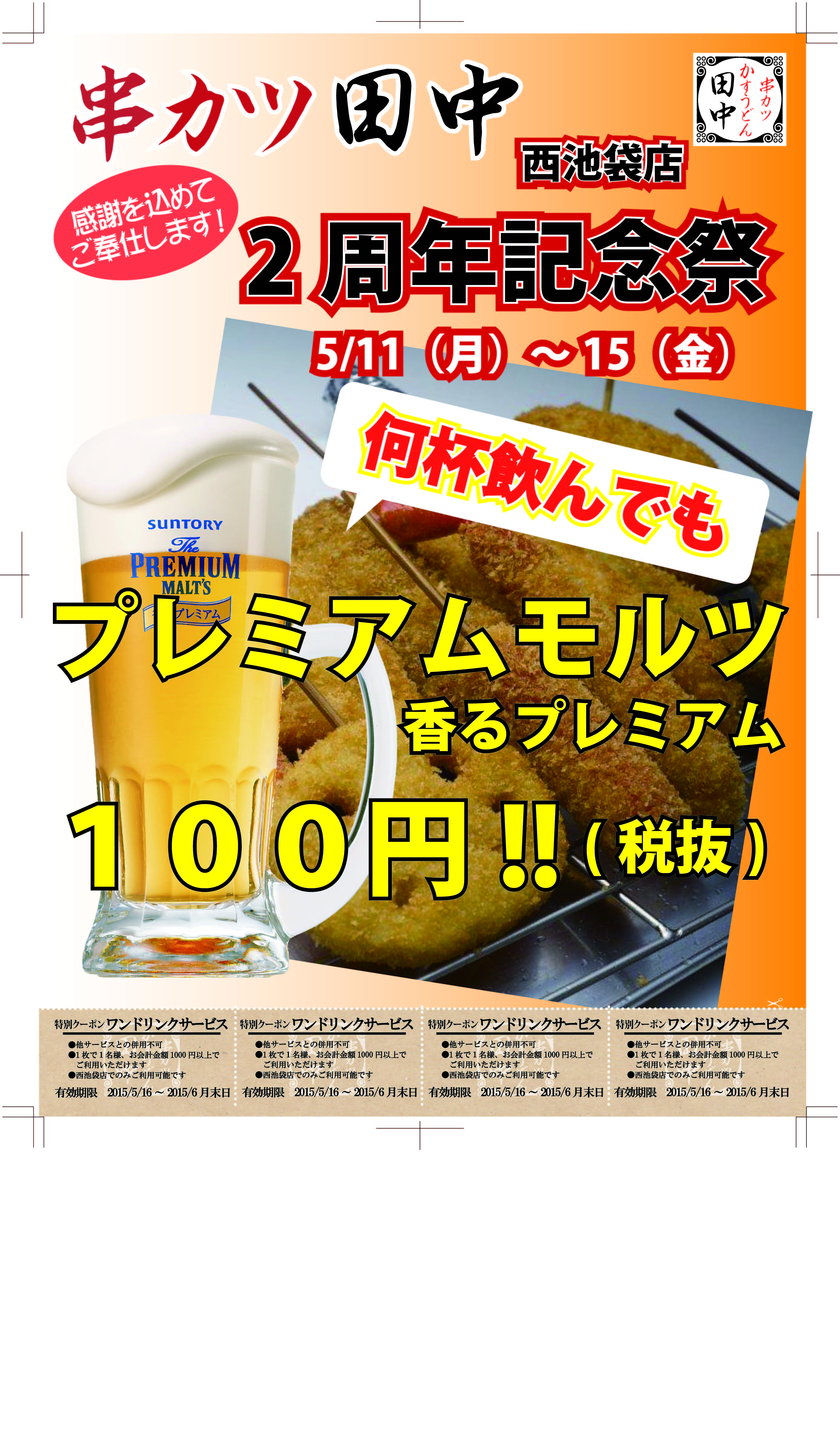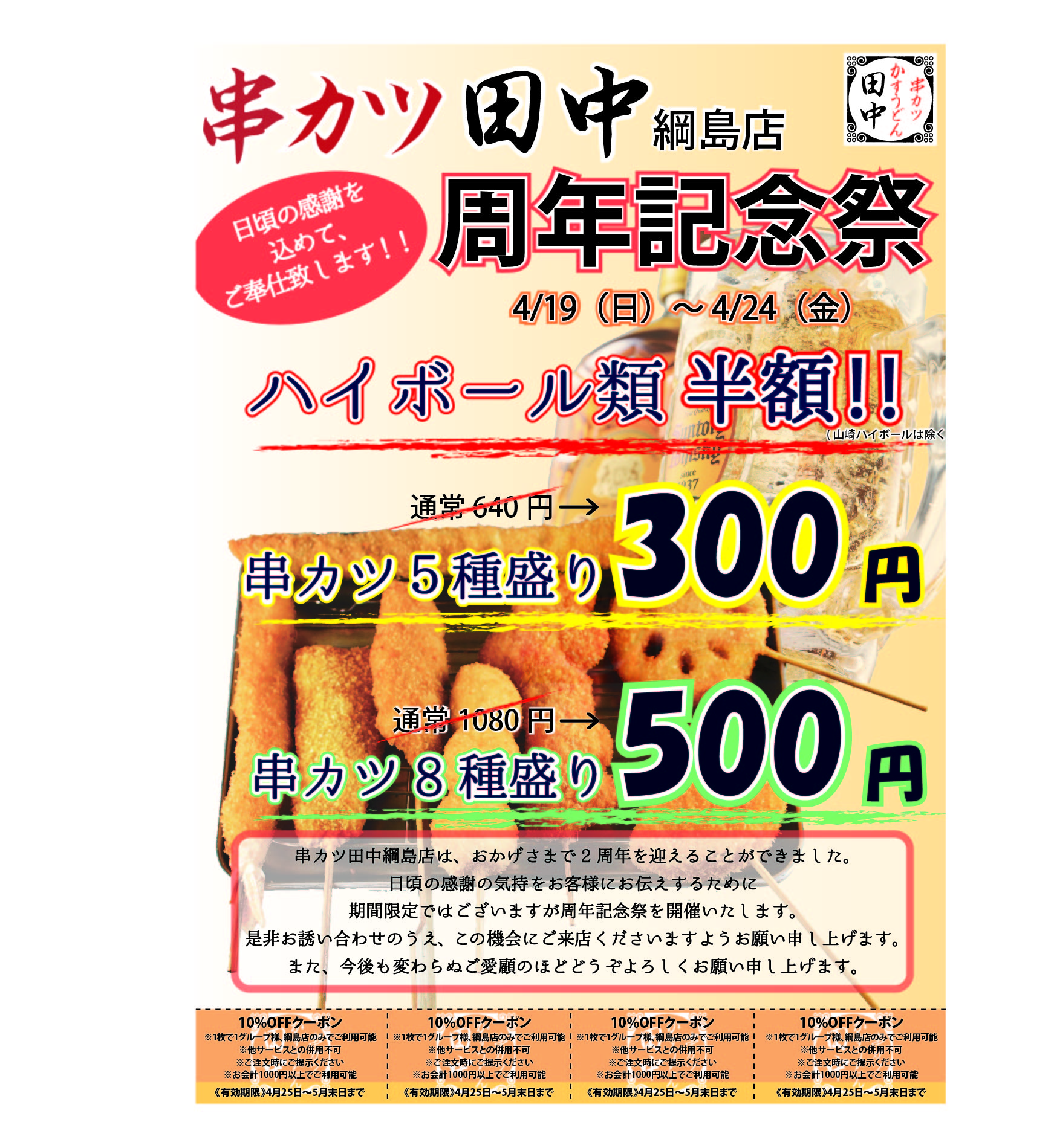 日頃、串カツ田中をご愛好頂き、誠にありがとうございます。 地域のお客様に支えられ、2周年を迎えることが出来ました。 そこで、感謝の...