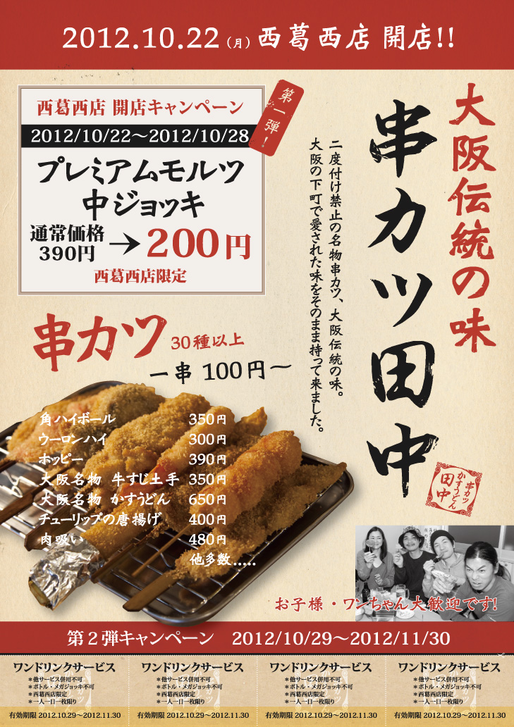 2012年9月13日 串カツ田中 吉祥寺店 17:00オープン!! 皆様のご来店心よりお待ち申し上げます。