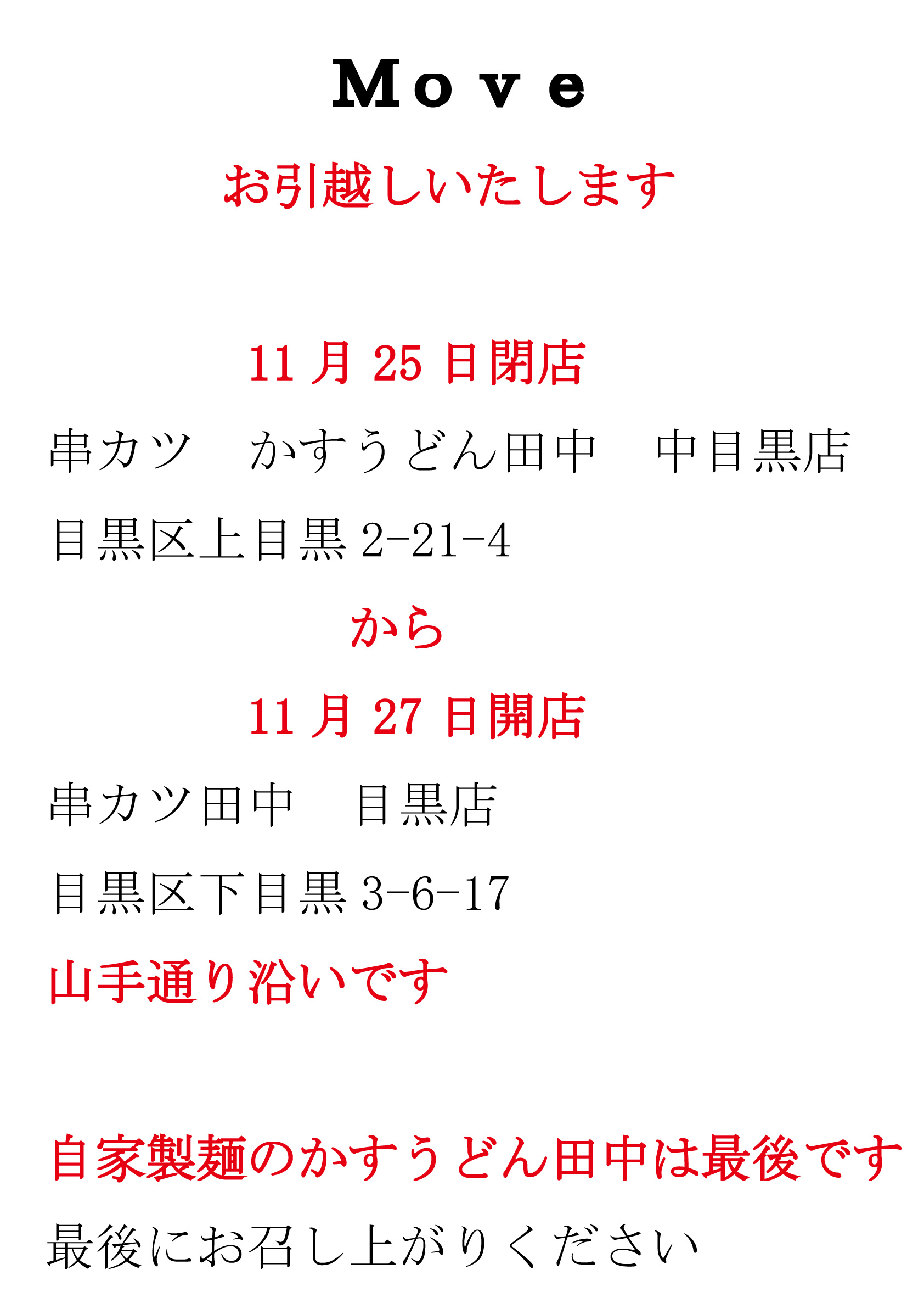 2012.11.25に中目黒店は閉店し2012.11.27に目黒店としてオープンします。 これからもよろしくお願いします。 かすうどん田中としての営業は...
