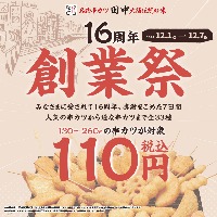 今年もやります! 16周年の感謝を込めた、 串カツ田中 創業祭!! 「串カツ田中」は、2008年12月7日に第1号店である世田谷店を開店して...