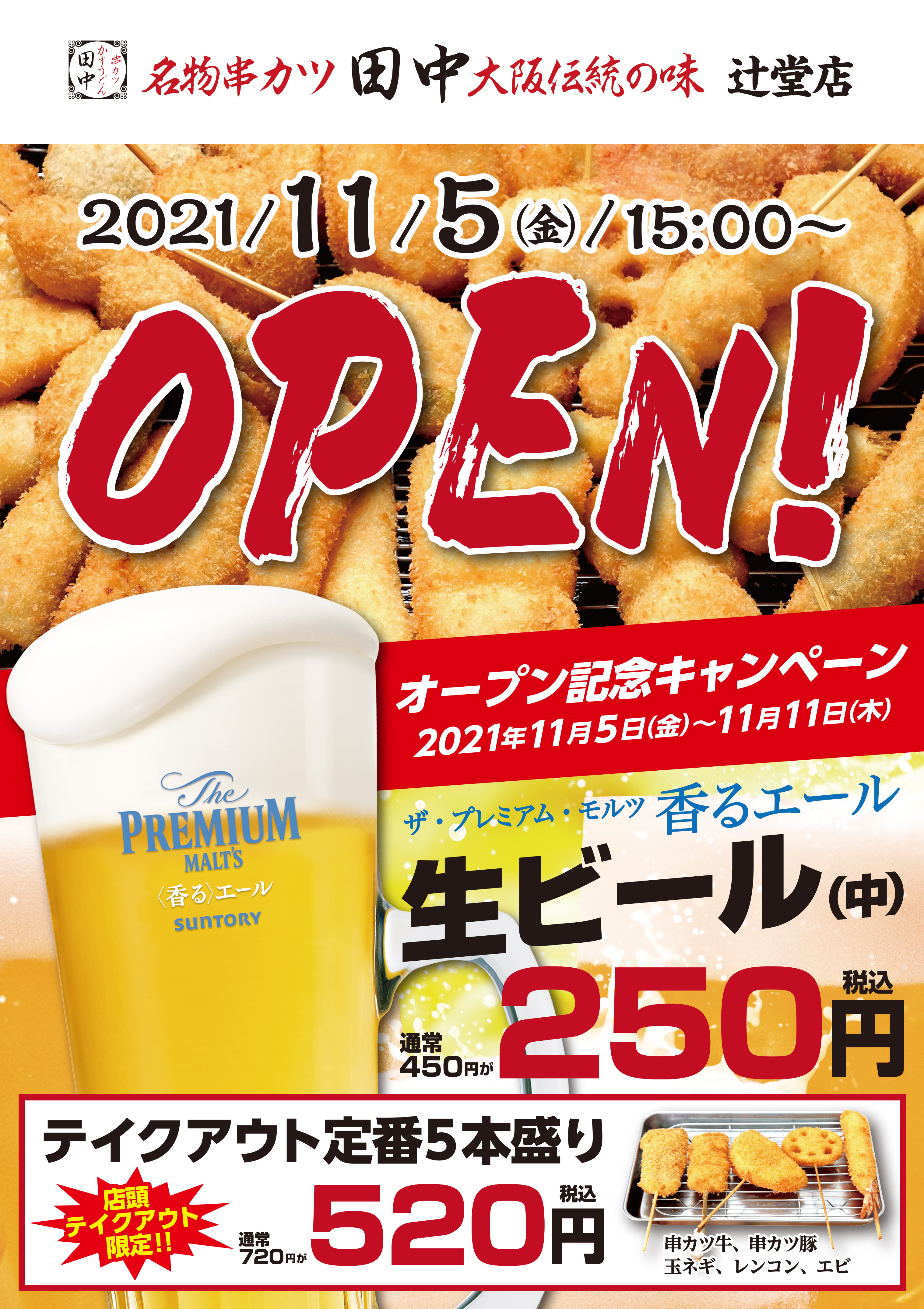 11月5日(金)単日プレオープン をしました 串カツ田中 松阪店 が 11月12日(金) 17:00~ グランドオープンいたします! オープ...