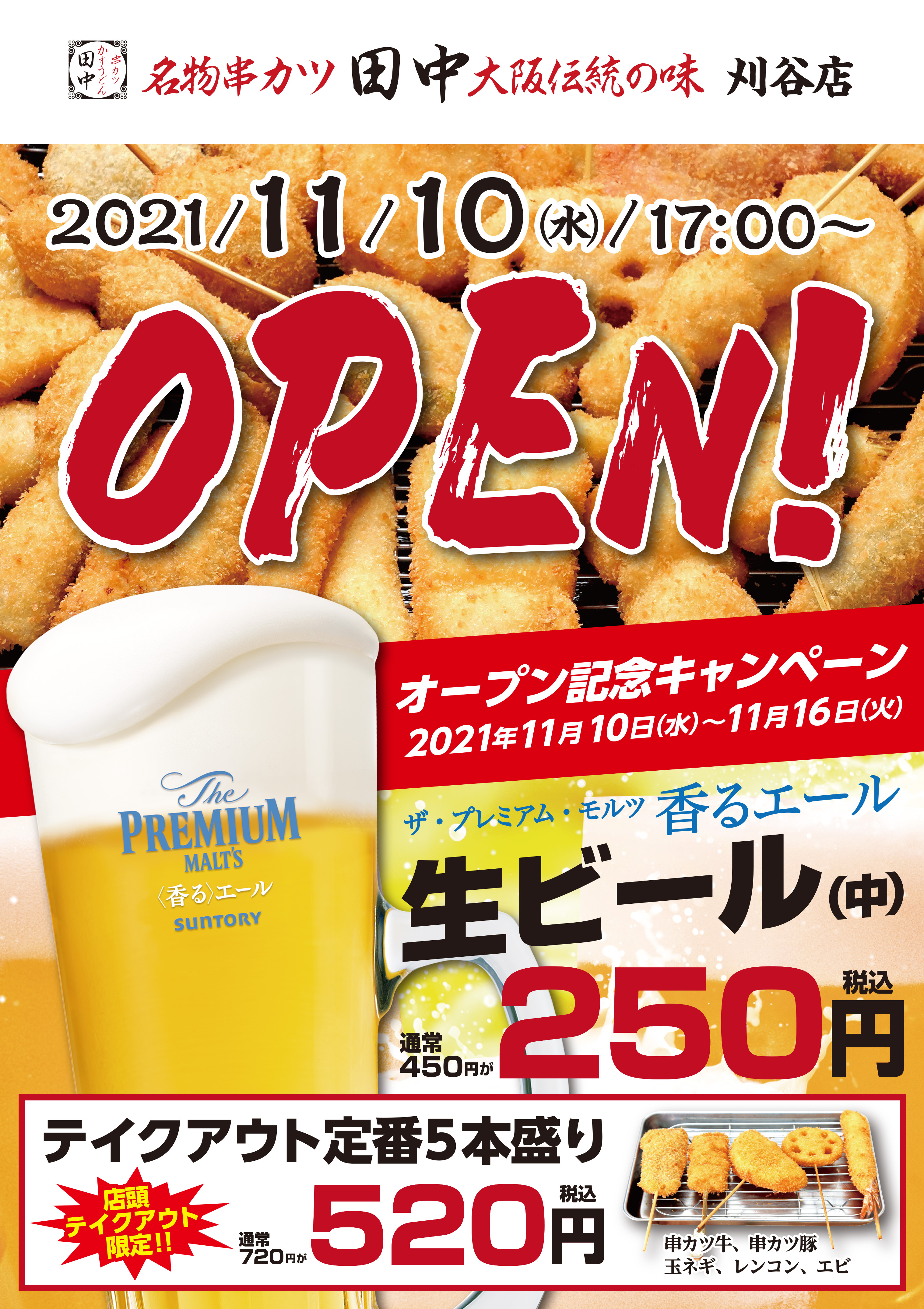 11月4日(木)単日プレオープン をしました 串カツ田中 刈谷店 が 11月10日(水) 17:00~ グランドオープンいたします! オープ...