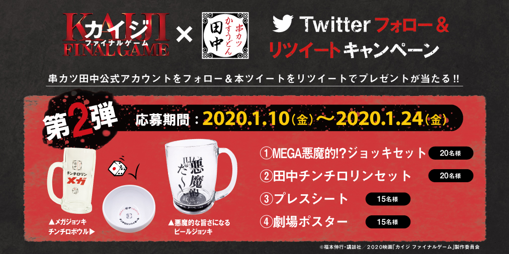 2019年12月26日(木)~2020年1月24日(金)の間、串カツ田中公式Twitterアカウントをフォローし該当ツイートをリツイートした方を対象に抽選で映画「カイジ ファイナルゲーム」の鑑賞券などが当たる、カイジファンの皆様にも、串カツ田中ファンの皆様にも楽しんで頂ける内容となっています。また、全国の串カツ田中では限定コラボポスターを掲示し本キャンペーンを盛り上げます。