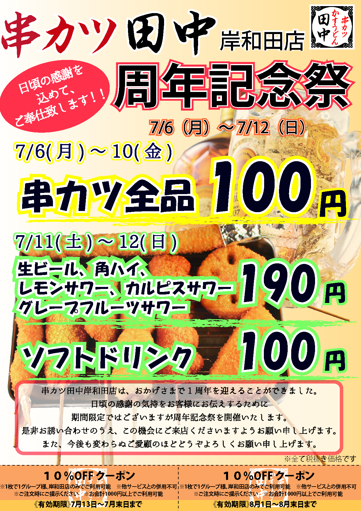地域のお客様に支えられ、串カツ田中岸和田店は1周年を迎えることが出来ました。
