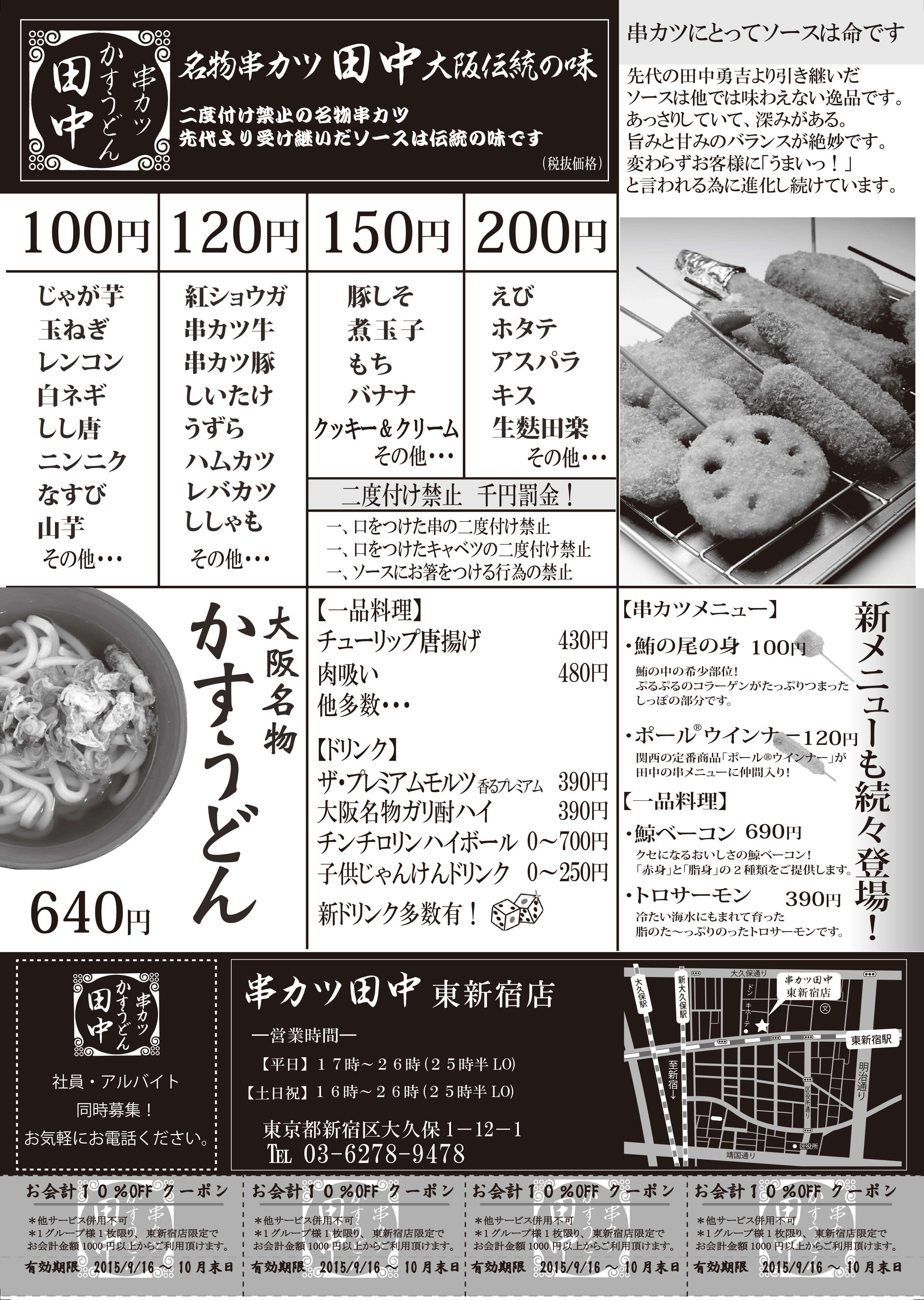 9月9日(水)17時串カツ田中東新宿店が新規オープンいたします!!