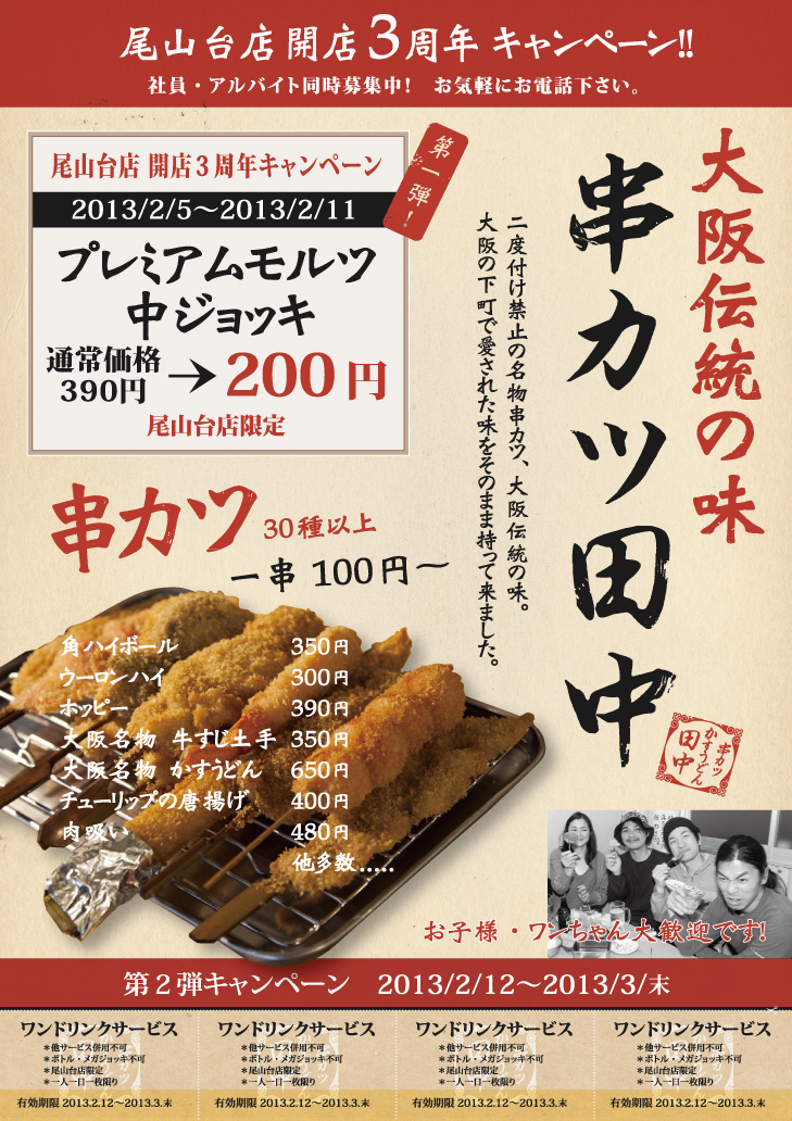串カツ田中 尾山台店は3周年キャンペーンを開催しています。