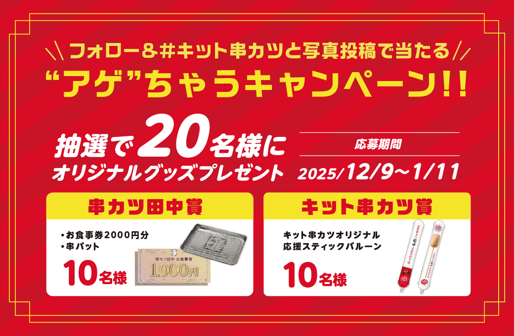 ■SNSキャンペーン第2弾:フォロー&#キット串カツと写真投稿で当たる!”アゲ”ちゃうキャンペーン