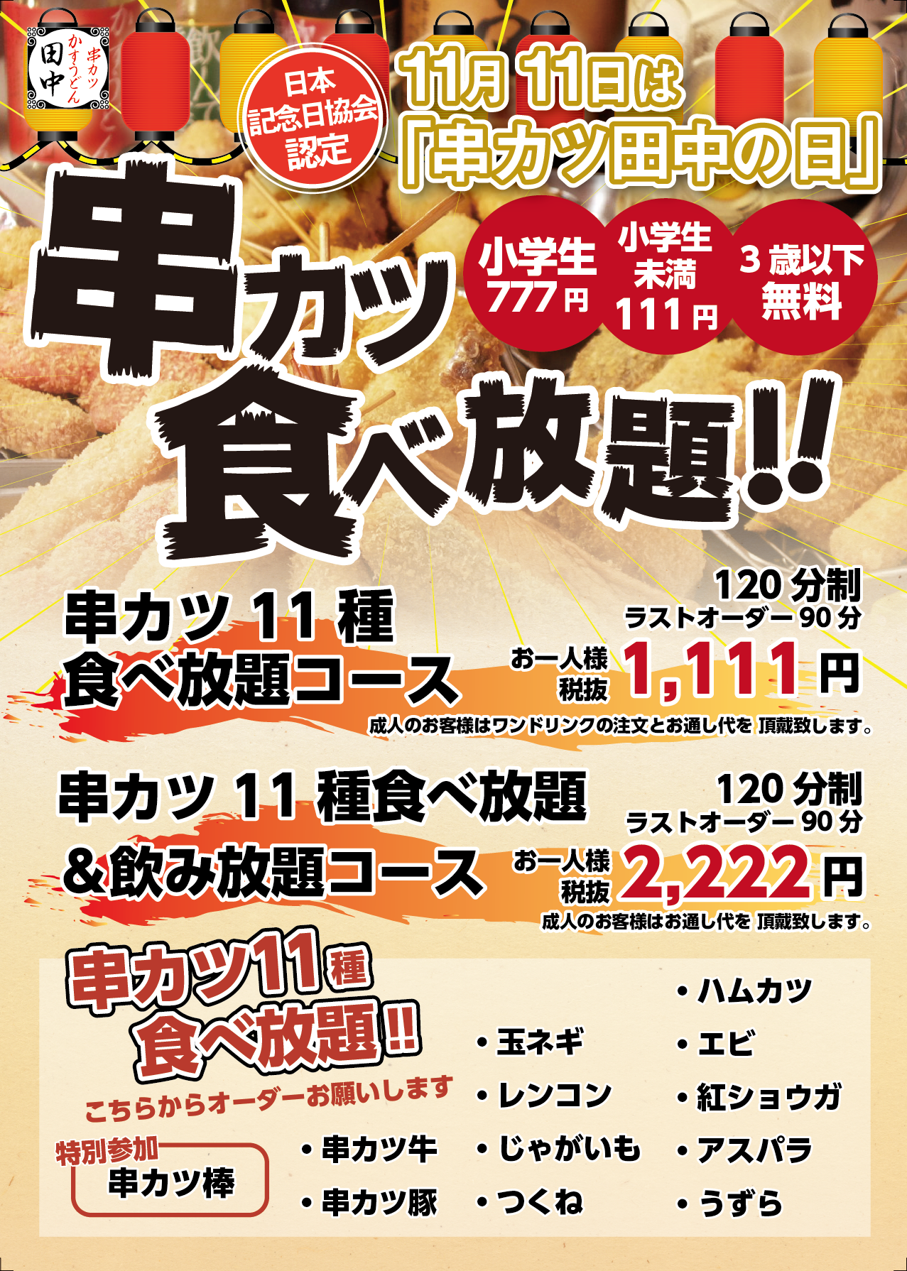 11月11日『串カツ田中の日』!【18時までの予約限定】